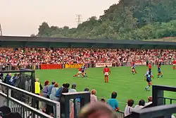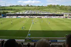 Originally called the Valley End, the Beechdean Terrace is the home supporters' end for football matches, and the only remaining standing accommodation in the stadium. The original licensed capacity of the terrace was 2,136; however, this was reduced by the club to 1,717 to maintain a total licensed capacity for the whole stadium of 10,000 after the extension of the Hillbottom Road end by 1,000 seats in 2001.[5] After the Sports Grounds Safety Authority re-evaluated the extent of the viewing area on the Valley End that was permitted to be included in the total capacity calculation in October 2015, the terrace's maximum capacity was provisionally reduced from 2,131 (officially licensed 1,717) to 1,494[7] pending remedial work to be carried out by the club in the near future.