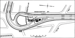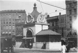 Scollay Square and Adams Square had similar baroque granite headhouses with four-sided clock towers designed by Charles Brigham. A small exit structure was located to the north, while the Brattle Loop used a separate entrance built into a building at Court Street and Brattle Street.[3] The headhouses of the Tremont Street subway were sharply criticized as "pretentiously monumental", with the Scollay Square headhouse compared to "an enlarged soda fountain".[4][5] Later stations on the East Boston Tunnel and Washington Street tunnel incorporated this criticism into their more modest headhouses.[4] In 1931, the headhouse was removed to improve visibility for automobile drivers and was replaced by a significantly smaller structure of modern design.[6][7] (Large headhouses at Scollay Square and Harvard were also torn down for similar reasons in that era.)[8]: 32 [9]