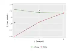 Group sequential design is the application of sequential analysis to clinical trials. At each interim analysis, investigators will use the current data to decide whether the trial should either stop or should continue to recruit more participants. The trial might stop either because the evidence that the treatment is working is strong ("stopping for benefit") or weak ("stopping for futility"). Whether a trial may stop for futility only, benefit only, or either, is stated in advance. A design has "binding stopping rules" when the trial must stop when a particular threshold of (either strong or weak) evidence is crossed at a particular interim analysis. Otherwise it has "non-binding stopping rules", in which case other information can be taken into account, for example safety data. The number of interim analyses is specified in advance, and can be anything from a single interim analysis (a "two-stage" design") to an interim analysis after every participant ("continuous monitoring").
