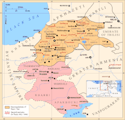 Adarnase IV began a policy of expansion towards the south, fortifying the city of Shavsheti and attaching numerous Byzantine provinces to his kingdom, as far as Erzurum. The king's territories now included part of Kartli, Klarjeti and Tao, and he claimed power over the whole of eastern and southern Georgia.[18] It is possible that this expansion took place with the agreement of Byzantium, which accepted the new situation in Caucasus and attempted a diplomatic reconciliation. Thus, in 891, when Adarnase entered into conflict with the Kouropalates Gurgen, Byzantium did not come to Gurgen's help.[8]