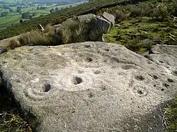 There is evidence of civilisation around Addingham as far back as the late Mesolithic, Neolithic and early Bronze Ages, as indicated by the remains of early man in the form of flint tools on Rombald's Moor, which may date back to around 11,000 BC.[4] The first 'fixed' artefacts are the 'cup and ring' marked stones, several of which can be found on top of Addingham Moor and Ilkley Moor to the east, which are thought to date back to the late Neolithic or early Bronze Age, around 1800 BC.[6]