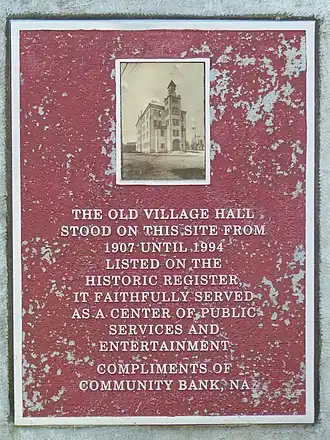 Addison Village Hall was a historic village hall located at Addison in Steuben County, New York. It was built in 1906 and is a four-story, greyish brown brick rectangular structure. The facade featured a projecting center pavilion that reaches five stories and is flanked by identical two story, one bay wings.[2] It was demolished in 1994 and the site is now occupied by the Old Village Hall Memorial Park.[3]