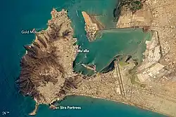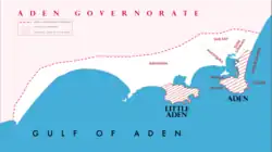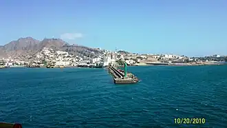 Aden (Arabic: عَدَنْ, romanized: ʿAdan) is a port city located in Yemen in the southern part of the Arabian peninsula, on the north coast of the Gulf of Aden, positioned near the eastern approach to the Red Sea. It is situated approximately 170 km (110 mi) east of the Bab-el-Mandeb strait. With its strategic location on the coastline, Aden serves as a gateway between the Red Sea and the Arabian Sea, making it a crucial maritime hub connecting Africa, Asia, and the Middle East. As of 2023, Aden city has a population of approximately 1,080,000 residents, making it one of the largest cities in Yemen.[8] Aden is the capital and principal part of Aden Governorate, encompassing eight districts. During the colonial period, the name Aden referred to the area along the north coast of the gulf, encompassing Tawahi, Mualla, Crater, and much of Khor Maksar district. The western harbour peninsula, known as Little Aden, now falls within the Al Buraiqeh district.