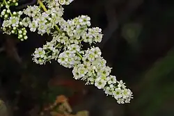 The inflorescence is dense to open, up to 17 cm long, and with 1 to 3 bractlets. Flowers are suspended on short pedicels 0 to 1.1 mm long.[4] The flowers are small, white, and inconspicuous yet showy.[5] The flowers have 5 petals and 5 calyx lobes, with the calyx lobes alternately arranged around the corolla.[3] The calyx lobes are wider than they are long.[4] There are 10 to 15 stamens, which occur in cylindrical to pyramid-shaped panicles at the tips of branches. The terminal clusters of flowers are 2.5 to 10 cm long.[5] The petals are retained into fruit maturation, turning a rusty brown color.[3] The hypanthium is 0.8 to 3.2 mm large, and strongly 10-ribbed.[4] The fruit is a small, ovoid achene, which develops within the hypanthium and disperses with the hypanthium as a single unit.[3]