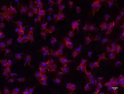 Adherent cell cultures are a type of cell culture that requires cells to be attached to a surface in order for growth to occur.[1] Most vertebrate-derived cells (with the exception of hematopoietic cells) are anchorage dependent and require a two-dimensional monolayer to facilitate cell adhesion, spreading and replication.[2] Cell samples can be taken from tissue explants or cell suspension cultures. Adherent cell cultures with an excess of nutrient-containing growth medium will continue to grow until they cover the available surface area.[3] Proteases like trypsin are most commonly used to break the adhesion from the cells to the flask. Alternatively, cell scrapers can be used to mechanically break the adhesion if introducing proteases could damage the cell cultures.[4][5] Unlike suspension cultures, the other main type of cell culture, adherent cultures require regular passaging performed using mechanical or enzymatic dissociation.[1] The culture can be visualized using an inverted microscope, however the growth of adherent cultures is dependent on the available surface area. For this reason, adherent cell cultures are not commonly used to obtain a high yield of cells, instead the use of suspension cultures is preferred.[4]