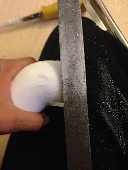 In general, abrasion is superior to other methods of surface preparations due to the fact that it is simple to perform, and it does not produce a significant amount of waste.[8] To prepare the adherend for bonding, the surface can be sanded or grit blasted with an abrasive material to roughen the surface and remove any loose material.[9][8] Rough surfaces produce stronger bonds because they have an increased surface area for the adhesive to bond to as compared to a relatively smooth surface.[7] In addition, roughening the surface will also increase mechanical interlocking.[6] Following abrasion, the adherend should always be wiped with solvent or an aqueous detergent solution to clean the surface of any oils and loose material and then dried. After this process is complete, the adhesive can be applied.[9]
