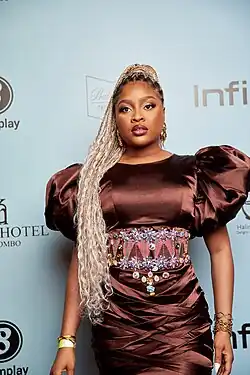 Adina Thembi Ndamse (born 3 October 1989)[2] better known by her stage name Adina is a Ghanaian-South African singer, songwriter, actress and sometimes a model. She was the winner of music reality show Stars of the Future in 2008.[3] Her eighth music single titled "Too Late" won her two awards – Record of the Year and Best Female Vocalist of the Year at the 2018 Vodafone Ghana Music Awards in Ghana.[4] In March 2021, she was among the Top 30 Most Influential Women in Music by the 3Music Awards Women's Brunch.[5]