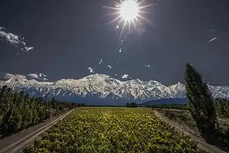 The Adrianna vineyard, planted at almost 5,000’ elevation in the Andes foothills, lies on the westernmost border of Tupungato Alto, Mendoza, Argentina, in a small district called Gualtallary.[1][2][3][4] It belongs to the Bodega Catena Zapata.[5] Being the highest vineyard in Mendoza, it benefits from the cooling effect [1][6][7] of the Andes Mountains and intense sunlight [8][9] resulting from extreme high altitude.[6] The increased sunlight intensity due to altitude translates into thicker grape skins, because the grapevine attempts to protect its seeds from the sun.[1] Grape skins are rich in tannins and polyphenols, the flavour-giving compounds in wine, explaining why the Adrianna Vineyard's high-altitude wines are so concentrated and capable of ageing.[1][7] Also, because of the cool mountain climate, the wines from Adrianna have a certain type of minerality [4][10][11] in the aromatics and palate that is not found in wines from other parts of Mendoza. The soils [4][12] of Catena Zapata´s Adrianna Vineyard are composed of limestone and large pebbles that make them particularly well drained; the yields are naturally low and berries are small and concentrated[1] Adrianna is possibly the world’s most studied vineyard.[2][5][13][14] The Adrianna Vineyard is well known for its single parcel Chardonnay wines White Bones and White Stones.[4][12] and its Malbec, which have been highly reviewed by world wine publications [3] [7] [15]