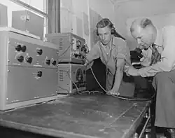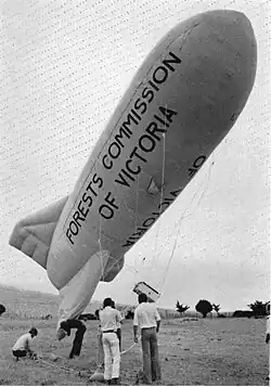 The Forests Commission's communication systems were regarded at the time to be more technicality advanced than the police and the military.[10] These pioneering efforts were directed by Geoff Weste[10] and by 1943-44 direct communication was possible between firefighting crews on the ground using portable, but heavy, RC-16 Radiophones and RAAF aircraft.[1] Although the technology of the portable radios remained primitive and the reception poor unless the user was on a high point somewhere. The HF radio signal was “line-of-sight” and bounced between fire towers and relay transmitters across the mountains back to the district offices.[14] In flat mallee desert country of north western Victoria balloons were used in the 1970s to increase radio coverage. Later the introduction of VHF radios, aeronautical radios operating within the airband and then digital mobile phones revolutionised bushfire communications.