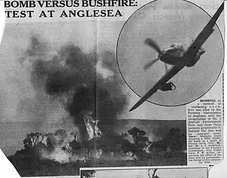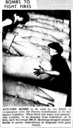 Further trials were conducted by the Forests Commission just after the end of WW2 at Anglesea in Victoria beginning in November 1946 to compare the performance of RAAF P51 Mustangs, Consolidated B-24 Liberators and Avro Lincoln Bombers dropping ammonium sulphate compounds in 500 lb bombs from about 100 feet which were designed to burst on impact. Several containers were tested on small fires for their accuracy, falling and bursting characteristics. The results were encouraging but inconclusive.[2]