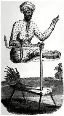 This illusion was first recorded by Thomas Frost in Lives of the Conjurors, 1876, as a performance by an old Brahmin in India in 1828 or 1829. The Brahmin died in 1830 without explaining his trick. He was followed by Sheshal, the Brahmin of the Air, who exhibited the illusion at Madras in 1832, apparently using only a stool, a hollow piece of bamboo, a piece of hide and some beads (pictured). Frost thought that it was "probably not very far from the truth" that there were supporting steel rods concealed within the bamboo and the hide, and that the rods were connected with a seat concealed within the performer's robes. The performer was set in place behind a screen.[1][2]