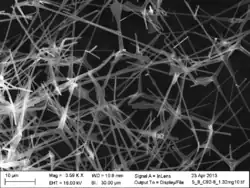 Aerographite is a black freestanding material that can be produced in various shapes occupying a volume of up to several cubic centimeters. It consists of a seamless interconnected network of carbon tubes that have micron-scale diameters and a wall thickness of about 15 nm. Because of the relatively lower curvature and larger wall thickness, these walls differ from the graphene-like shells of carbon nanotubes and resemble vitreous carbon in their properties. These walls are often discontinuous and contain wrinkled areas that improve the elastic properties of aerographite. The carbon bonding in aerographite has an sp2 character, as confirmed by electron energy loss spectroscopy and electrical conductivity measurements. Upon external compression, the conductivity increases, along with material density, from ~0.2 S/m at 0.18 mg/cm3 to 0.8 S/m at 0.2 mg/cm3. The conductivity is higher for a denser material, 37 S/m at 50 mg/cm3.[1]