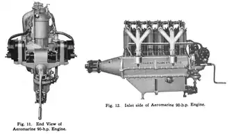 The Aeromarine 90 hp was the first aircraft motor built by the Aeromarine Plane and Motor Company in 1914. In that year, Aeromarine had acquired the patents and manufacturing rights to the aircraft and engines of the Boland brothers. Although the Boland brothers didn't make a 6-cylinder engine, their V-8's all used the unusual concentric valve that is used in this engine. In spite of its model name, this engine only produced 85 hp (63 kW) at 1,400 rpm [1][2][3]