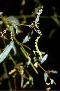 This plant is an annual or perennial herb growing up to 2 meters tall. The leaves are up to 7 centimeters long and have several pairs of linear to oblong leaflets. The sensitive leaves fold up when touched. The inflorescence is a raceme of flowers each up to a centimeter long. The flowers range in color from white to pinkish, orange, or purplish. The fruit is a curved legume pod up to 4 centimeters long made up of several jointed units, each unit containing a seed.[3]