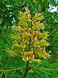 The most familiar member of the genus worldwide is the common horse chestnut, Aesculus hippocastanum. The yellow buckeye, Aesculus flava (syn. A. octandra), is also a valuable ornamental tree with yellow flowers, but is less widely planted. Among the smaller species is the bottlebrush buckeye, Aesculus parviflora, a flowering shrub. Several other members of the genus are used as ornamentals, and several horticultural hybrids have also been developed, most notably the red horse chestnut Aesculus × carnea, a hybrid between A. hippocastanum and A. pavia.