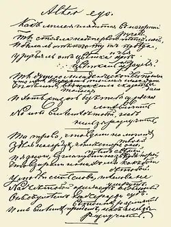 Afanasy Afanasyevich Fet (Russian: Афана́сий Афана́сьевич Фет, IPA: [ɐfɐˈnasʲɪj ɐfɐˈnasʲjɪvʲɪtɕ ˈfʲɛt] ⓘ), later known as Shenshin (Russian: Шенши́н, IPA: [ʂɨnˈʂɨn] ⓘ; 5 December [O.S. 23 November] 1820 – 3 December [O.S. 21 November] 1892), was a renowned Russian poet regarded as the finest master of lyric verse in Russian literature.[1][2]