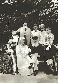 In 1857 in Paris Afanasy Fet married Maria Petrovna Botkina (the daughter of a rich tea-trader and sister of his good friend, literary critic Vasily Botkin), described as an exceptionally kind and sympathetic person, totally devoid of jealousy, who was perfectly happy to treat her husband "like a nanny treats a child".[14] In 1858 Fet retired from army service and returned to Moscow.[4] A year later he purchased the desolate Stepanovka khutor in the Mtsensk region of Oryol gubernia, and in 1860 moved there.[2] In the course of the next fourteen years he turned a piece of bare (even if fertile) land into a flourishing garden, launched a horse-breeding farm, built a mill and embarked upon agricultural ventures which proved successful and lucrative.[4] In 1862 Russky Vestnik started to publish his articles on agricultural commerce and economy.[15] All this evoked sharp criticism from, among others, Mikhail Saltykov-Shchedrin.[6] "One of those who have disappeared down into their earthly holes is now Fet who… in the moments of leisure produces by turns now a fine romance, next a misanthropic essay, then another romance, and more misanthropy," he wrote.[16] For eleven years (1867–1877) Fet served as a local Justice of the peace and became much respected both by peasants and by fellow landowners.[4]