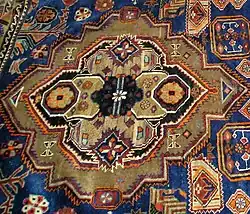 Ahcha carpets are woven by the Erazi people in 2 provinces: Samangan and Kunduz.[24] All of these rugs use scribble wool, which is dyed in shades of red, brown, indigo, and black. Usually Ahcha carpets are red, sometimes at the special request of customers are made in other tones, so for example, the central field is made in a color range from light brown to golden yellow shades or also with a dark blue central field and light yellow patterns. Some modern rugs use green for pattern details. In addition to Ahcha rugs, various Bezeheri patterns are also woven in Kunduz (the eastern carpet-producing province of Afghanistan). These common motifs include rows of stylized flowers or flower-shaped hexagons on a central field that run together in the center and are framed by decorated crochet and ram's horn patterns. The center field is usually light red, the pattern is dark red and orange with blue, green, white or black color borders (edging) to better highlight details.[25][26]