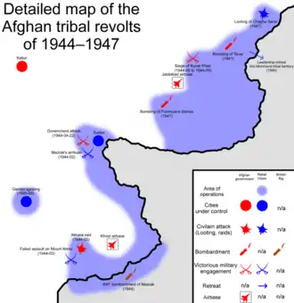 Mazrak was forced to retreat into the hills following an attack by the Afghan government on 22 April 1944.[18] On 25 April, the Afghan government dispatched 6 Hawker Hind aircraft[19] to Gardez[14] to deal with the uprising, which returned on 21 June.[19] During that operation, the Hind aircraft were focused on dropping leaflets and incendiary bombs.[19] No large explosives were dropped, but there were several instances of hostile tribesmen being gunned down by the aircraft. 2-3 villages were said to have been destroyed by incendiary bombs during this time.[19] On request of the Afghan government, the British Raj took precautions to prevent Waziri tribesmen from aiding Mazrak.[18]