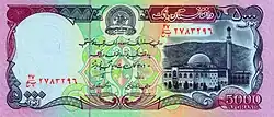 Afs. 5,000 | 165 × 74 mm | Purple | Seal of Da Afghanistan Bank, Pul-e Khishti Mosque | Tomb of Ahmad Shah Durrani | |