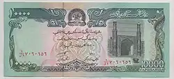 Afs. 10,000 | 170 × 77 mm | Turquoise | Seal of Da Afghanistan Bank, Great Mosque of Herat | Qala-e-Bost |