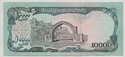 "A 'pothole cave' or 'mouth of a shaft' (or Pit cave) is said to be visible on the Afs. 10,000 banknote from 1993 as a limited dark area in the hillside above the ancient 'pol' or gateway at the ruins near Lashkar Gah. This is possibly the entrance to one of the man-made undergrounds at Qala-e-Bost."[33]