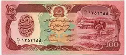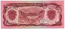 Afs. 100 | 142 × 62 mm | Pink | Seal of Da Afghanistan Bank, peasant | Dam, hydroelectric power station |