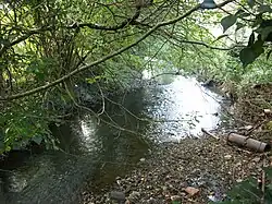Leaving Rhiwsaeson, about a mile (1.5 km) east of Cross Inn, the Clun widens to between about eight feet (2.4 metres) and 12 feet (3.7 metres) and slows. Here, where the Clun flows to the south of Cross Inn, as well as along the banks of Nant Dowlais and Nant Myddlyn, evidence of otter activity has been noted.[6] The river flows to the south of the A473 Pontypridd to Bridgend (Penybont ar Ogwr) road (Talbot Green By-Pass), where it is fed from the south by Nant Mwyndy. Nant Mwyndy flows over a bedrock of Carboniferous Limestone, rising in Creigiau and, flowing westwards, immediately north of Groesfaen, passing a small industrial estate at Mwyndy, feeding a lake resulting from Victorian opencast iron mining (see History below) and turning south to flow past Cefn-y-Parc Cemetery, Penygawsi, before reaching its confluence with the Afon Clun.[7][8]