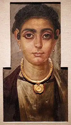 The dental morphology[18] of the Roman-period Faiyum mummies was also compared with that of earlier Egyptian populations, and was found to be "much more closely akin" to that of ancient Egyptians than to Greeks or other European populations.[19] Victor J. Katz notes that "research in papyri dating from the early centuries of the common era demonstrates that a significant amount of intermarriage took place between the Greek and Egyptian communities".[20]