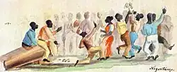 This process had an important reflection on historiography. Nineteenth-century writers tried to annul the peculiarities of the different black groups, homogenizing and stereotyping a culture that was originally dynamic and polymorphic,[23] and throughout the twentieth century, for a long time, it was claimed that in the nineteenth century a "racial democracy" had existed in the state, where slaves were treated kindly and had a much higher quality of life than in other states.[27] The speech of the province president on the eve of the abolition of slavery in Porto Alegre, in 1884, which established a form of freedom conditioned to additional compulsory labor for a number of years, stating that "the freedmen will prefer in their great majority to follow their former benefactors because in Rio Grande do Sul slavery was always a family institution, the slave participating in all the advantages of the masters, to whom they must be tied today by the bonds of gratitude and whose intelligence and experience they cannot do without."[28] It was also claimed that the black presence had been insignificant and that the state culture had been built by whites.[4] Recent studies have proved that these claims are myths and do not correspond to the facts, and have documented the inhumane treatment to which most slaves were subjected as well as the large contribution of blacks to the culture.[4][27]