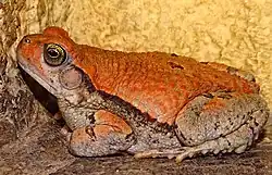 The African red toad (Schismaderma carens), or African split-skin toad, is a species of toad in the family Bufonidae.[2] It is the only species of the monotypic genus Schismaderma.[3] It is found in Angola, Botswana, Democratic Republic of the Congo, Eswatini, Kenya, Malawi, Mozambique, Namibia, South Africa, Tanzania, Zambia, Zimbabwe, and possibly Lesotho. Its natural habitats are dry savanna, moist savanna, subtropical or tropical dry shrubland, subtropical or tropical moist shrubland, subtropical or tropical dry lowland grassland, freshwater marshes, intermittent freshwater marshes, arable land, pastureland, urban areas, water storage areas, ponds, canals and ditches, and man-made karsts.[1]