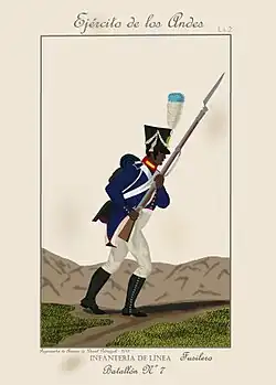In 1816 a part of the 7th Infantry Regiment joined the army under the command of Lieutenant Colonel Pedro Conde, with 600 blacks. In December of that year, San Martín ordered the division of the regiment into two independent battalions: the 8th Infantry Battalion and the 7th Infantry Battalion, under the command of Lieutenant Colonels Ambrosio Crámer and Pedro Conde, respectively. It was agreed with the Cuyan owners that two thirds of the slaves would be incorporated into the army, with 710 being recruited in Cuyo. Thus, although a contingent arrived with number 8 from Buenos Aires, most of its troops were recruited in the provinces. However, the army was nourished mainly by slaves (which Lynch estimates at 1,554 slaves).[17] The age for the recruitment of slaves initially imposed between 16 and 35 years, was extended between 14 and 55 years.[18]