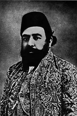 Aqa Ali Shah was born in 1830 at Mahallat in Iran. He was the eldest son of Aga Khan I and the only surviving male issue of his father with Sarv-i Jahan Khanum (Sarv-i Jahān Khānum, d. 1882). Aqa Ali Shah was a member of the Iranian royal family, as his mother was the daughter of Fat′h Ali Shah, the second ruler of the Qajar dynasty.[1] His rank as a prince of the royal family was also recognized by Nasser al-Din Shah Qajar when Aqa Ali Shah's father died. Nasser al-Din himself carried out a ceremony performed among Persian princes to mark the end of mourning of deceased relations. In addition, Nasser al-Din sent a robe of honour and the emblem of the Persian Crown studded with diamonds to Aga Ali Shah as a sign of the Shah's relationship with the Aga Khan's family.[2]