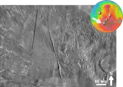 Aganippe Fossa is a fossa (surface feature) on Mars in the Phoenicis Lacus quadrangle. It is a graben that stretches around 600 km (370 mi).[1] It is named after a classical albedo feature.[2] It was first spotted in 1930, and officially named in 1976.[2] The name Aganippe is a reference to its location at the base of a volcano.[3] How it came to be is a subject of debate, with the geomorphology indicating it likely developed due to a collapse of lava tubes underneath.[4] Tectonic movement, specifically glaciation, had previously been suggested.[5]: 14