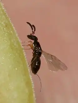 - ^ Astrid Cruaud, Jean-Yves Rasplus, Junxia Zhang, Roger Burks, Gérard Delvare, Lucian Fusu, Alex Gumovsky, John T. Huber, Petr Janšta, Mircea-Dan Mitroiu, John S. Noyes, Simon van Noort, Austin Baker, Julie Böhmová, Hannes Baur, Bonnie B. Blaimer, Seán G. Brady, Kristýna Bubeníková, Marguerite Chartois, Robert S. Copeland, Natalie Dale-Skey Papilloud, Ana Dal Molin, Chrysalyn Dominguez, Marco Gebiola, Emilio Guerrieri, Robert L. Kresslein, Lars Krogmann, Emily Lemmon, Elizabeth A. Murray, Sabine Nidelet, José Luis Nieves-Aldrey, Ryan K. Perry, Ralph S. Peters, Andrew Polaszek, Laure Sauné, Javier Torréns, Serguei Triapitsyn, Ekaterina V. Tselikh, Matthew Yoder, Alan R. Lemmon, James B. Woolley, John M. Heraty. (2024). The Chalcidoidea bush of life: evolutionary history of a massive radiation of minute wasps. Cladistics, 40(1), 34-63.