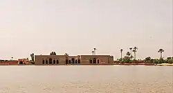 The Dar al-Hana, a palatial pavilion, stands on the southern side of the largest and oldest reservoir of the Agdal. The pavilion and the reservoir were surrounded by their own rectangular wall enclosure, with a main gate to the north which was aligned with the main north-south axis of the gardens leading from the Kasbah of the city. The north gate is integrated into an observation pavilion (menzeh) that rises above it. In addition to the residential palace pavilion, there are several other historical structures nearby which were part of the ensemble. Right next to the pavilion, on its east side, is a boathouse which was connected with the reservoir. The sultan's stables were housed in a structure a short distance to the southwest of this, which consists of nine long vaulted halls subdivided by rows of arches. On the east edge of the reservoir are the remains of a much smaller pavilion dating to the Saadian period, which probably once faced a similar pavilion on the west side of the reservoir. At the northwestern corner of the enclosure is a warehouse which once stored munitions, while just east of this are the remains of an animal-powered mill.[8]