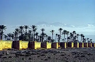 For the rest of its history, the gardens went through a cycle of decline and renewal. When neglected, the gardens quickly ran dry and were prone to desertification. During periods of renewal, later rulers were required to replant the gardens and clear sediments from the reservoirs and channels.[3] After the defeat of the Almohads in the 13th century Marrakesh ceased to be the capital and the gardens underwent a first period of decline. It was only under the Saadian dynasty in the 16th century that the capital returned to the city and the Kasbah, along with the gardens, were restored and redeveloped. During this period the gardens became known as Rawd al-Masarra ("Garden of Happiness").[3][2] The first restoration works, mainly aimed at rehabilitating the water supply system, were carried out by Sultan Abdallah al-Ghalib and further work was continued by Ahmad al-Mansur.[2] Both of them also worked on rebuilding the city's kasbah to the north.[5][7] Historical sources also mention that the Al-Masarra gardens were open to the public and to all of the city's citizens, a tradition which continues to the present day.[2]