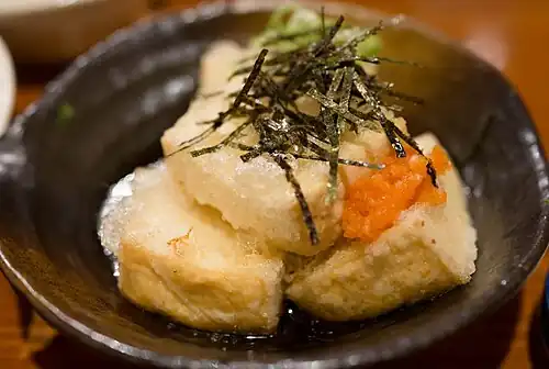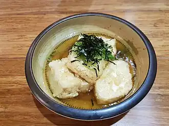 Agedashi dōfu (揚げ出し豆腐, "lightly deep-fried tofu") is a Japanese hot tofu dish. Soft or medium-firm silken tofu (kinugoshi) is cut into cubes, before being lightly dusted with potato starch or cornstarch and then deep-fried until golden brown. It is then served in a hot broth (tentsuyu) made of dashi, mirin, and shō-yu (Japanese soy sauce), with finely-chopped negi (a type of spring onion) and grated daikon or katsuobushi (dried skipjack tuna flakes) sprinkled on top.[1]