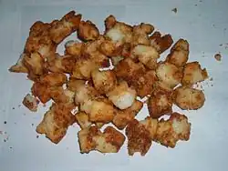 Agemochi (揚げ餅) is a popular Japanese snack food made from fried mochi (sticky rice). The dry mochi is broken into small pieces, about 1 cm cubed, and deep fried. The pieces then puff up. It is usually eaten lightly salted, but also various flavoured versions are made, such as shichimi agemochi, which is agemochi covered with shichimi seasoning. Agemochi can be purchased over most of Japan, and is also a common home-made snack.[1][2]