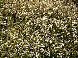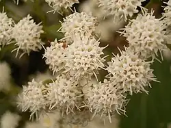 The serrated leaves on average reach 7.5 cm long and 2.5 cm wide and taper at each end. The leaves form in opposing pairs which are coarsely serrated except near the base.[19][14] The species is related to and closely resembles Ageratina adenophora. However, its distinctive serrated leaves may be used to distinguish mistflower from A. adenophora.[14] The white flowers are also similar in appearance to A. adenphora.[20] The flowers are white with dense heads at the ends of the branches. Mistflower buds from July until August, and may flower from August through March in some climates.[19][14] Its seeds are black, slender, angular, 2 mm long, with fine white hairs at the tip. They are dispersed by wind and flowing water. Mature plants can produce around 10,000 to 100,000 seeds per year.[19][21]