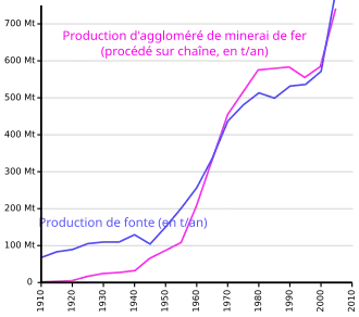 It took some thirty years for the sintering of ores on chains to become widespread in the steel industry. Whereas before the Second World War, it was mainly used for reconditioning ore fines, after 1945 it became widespread for processing raw ores. Today, it plays an essential role in the blending of different ores and, above all, in the incorporation of mineral wastes of varying iron content. This recycling role improves profitability and limits the amount of waste generated by steel complexes, which generate numerous iron-rich residues (slag, sludge, dust, etc.).[2]