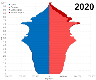 Japan has the highest proportion of elderly citizens of any country in the world.[1] 2014 estimates showed that about 38% of the Japanese population was above the age of 60, and 25.9% was above the age of 65, a figure that increased to 29.1% by 2022. By 2050, an estimated one-third of the population in Japan is expected to be 65 and older.[2] Population aging in Japan preceded similar trends in other countries, such as South Korea and China.[3][4]