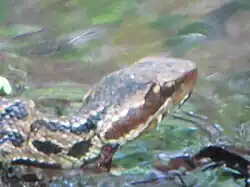 The eastern cottonmouth (Agkistrodon piscivorus piscivorus)[4][5] was once classified as a subspecies of the cottonmouth (Agkistrodon piscivorus). However, DNA based studies published in 2008 and 2015, revealed no significant genetic difference between the eastern cottonmouth (Agkistrodon piscivorus piscivorus) and the western cottonmouth (Agkistrodon piscivorus leucostoma) and synonymized the two subspecies (with the oldest published name, A. piscivorus, having priority). The resulting taxonomy does not recognizes the eastern cottonmouth (A. p. piscivorus) as a valid taxon.[7][8] Several subsequent reviews and species accounts have followed and supported the revised taxonomy.[9][10]: 437 p. [11] Information on this snake can be found in the Agkistrodon piscivorus article.