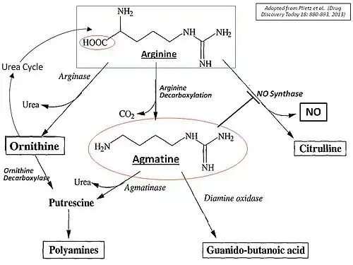 - ^ Piletz JE, Aricioglu F, Cheng JT, Fairbanks CA, Gilad VH, Haenisch B, Halaris A, Hong S, Lee JE, Li J, Liu P, Molderings GJ, Rodrigues AL, Satriano J, Seong GJ (2013-09-01). "Agmatine: clinical applications after 100 years in translation". Drug Discovery Today. 18 (17): 880–893. doi:10.1016/j.drudis.2013.05.017. ISSN 1359-6446.