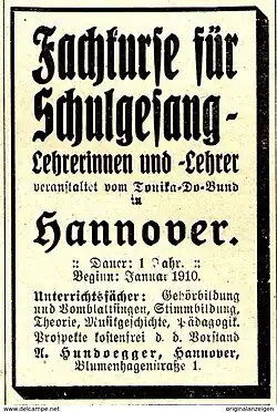 In 1909 Hundoegger founded the Tonika-Do-Bund and the Tonika-Do-Verlag to promote the dissemination of the Tonika-Do doctrine and to intensify the internal exchange of ideas. In 1923, four years before her death, she was able to state that the "tonic-do cause [...] had grown from a small seed, without any loud propaganda, with quiet continuity into a strong stem".[6]