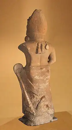 A statue of Agnipani ("Fire-holder") Yaksha from BharanaKalan, visible in the Mathura Museum, is dated to circa 100 BCE.[2] It was discovered in Bharana Kalan, 32 kilometers northwest of Mathura.[2] In the statue, Agni has a flame-shaped "aureole" with incised tongues of flames behind his turbanned head, and he hold a water flask in the left hand, some fragments of which remain.[2][1] His right hand may have been held out in "Abhaya mudra", as also seen in other statues of Agni.[2]