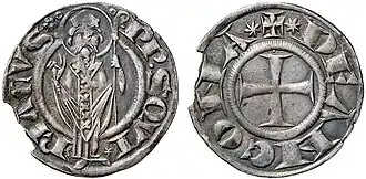 The first reports of Ancona's medieval coinage begin in the 12th century when the independence of the city grew and it began to mint coinage without Imperial or papal oversight.[1] According to some traditions the city began minting currency by concession of the Byzantine Empire, following the fidelity demonstrated during the siege of 1173,which also led to the city's acquisition of its flag of the gold cross on a red field. This story may be doubtful as records for it are late and not supported by contemporary sources.[2]