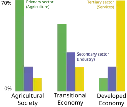On the three-sector theory, the proportion of people working in agriculture (left-hard bar in each group, green) falls as an economy becomes more developed.