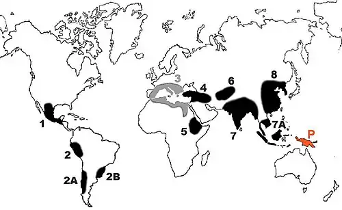 Centres of origin, as numbered by Nikolai Vavilov in the 1930s.