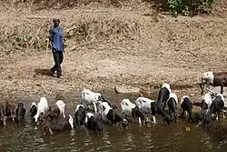There is no predominant breed of cattle in the country, with a constant mixing of the herd. Breeds most common in Benin include Lagune (Dwarf West African Shorthorn), Somba (Savannah Shorthorn), Borgou (local cross between Zebu and humpless crossbred), and Zebu. Most of the cattle are raised in a seasonal migration pattern, with a small portion (20% or less) raised in a sedentary manner mostly in the southern portions of the country. Borgou, Alibori, Atacora, and Donga Districts hold most of the cattle. Fulani are the main herders, and often work for hire. Herds are moved from north to south and back, depending upon available forage and water supplies. Herds in the north can be as large as 80 or so animals. Most cattle are raised for meat, some cattle near towns produce milk for sale. A few cattle in the northeast area are raised in small herds with very limited movement (Somba farmers), and a larger group in the southern area are raised with a few animals per household, where the households are in areas demarked by waterways. Here the animals are moved around depending on availability of forage from location to location, household by household. Some villages hire herdsmen to oversee the village animals. Total herd size for the country is estimated at between 750,000 and 1 million animals.[1]